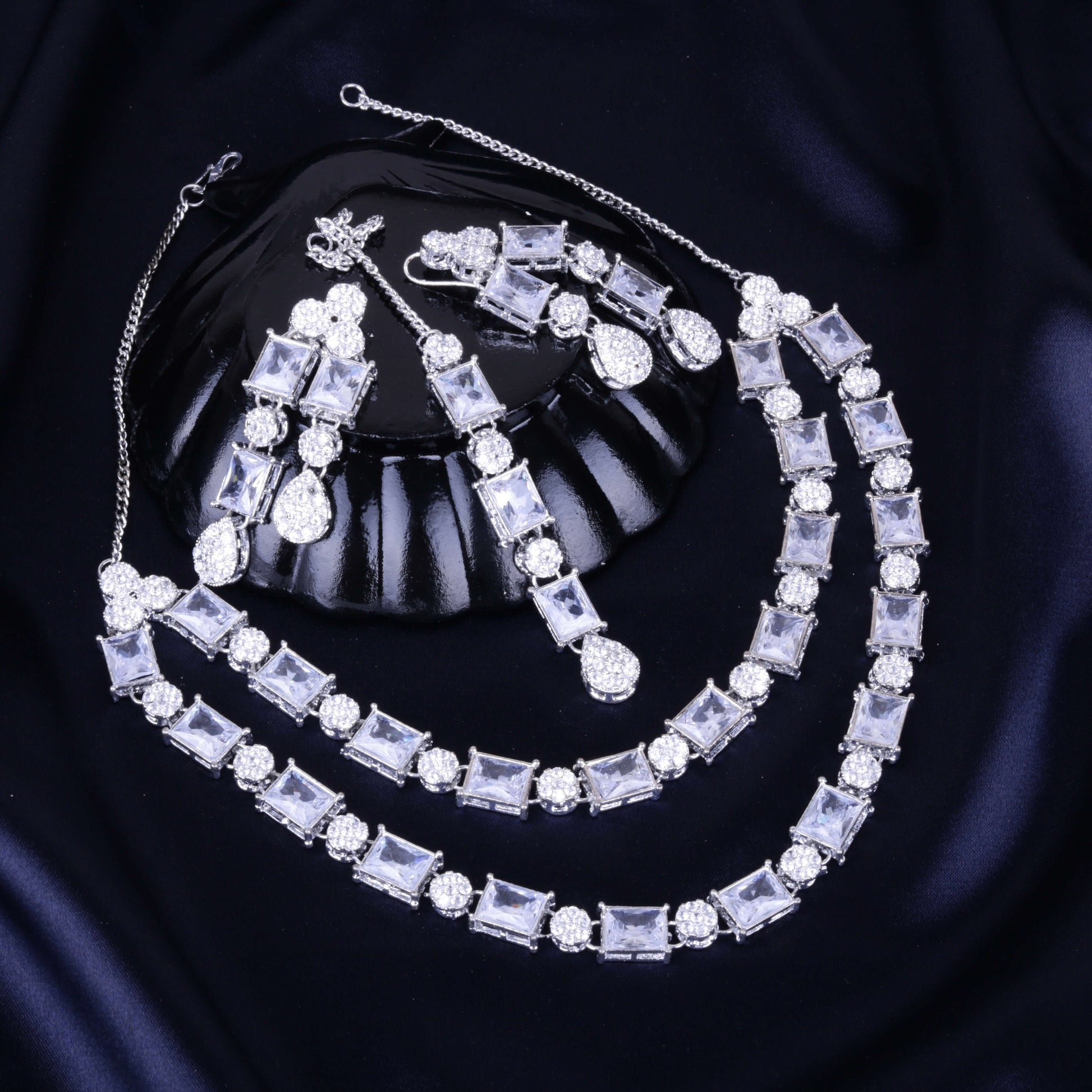 Expertly crafted with a silver plating, this Jewellery Necklace Set boasts a shimmering AD design. Perfect for adding a touch of elegance to any outfit, this set is a must-have for any jewelry collection. Elevate your style with this stunning necklace set. Note: Image may be vary slightly from the actual product