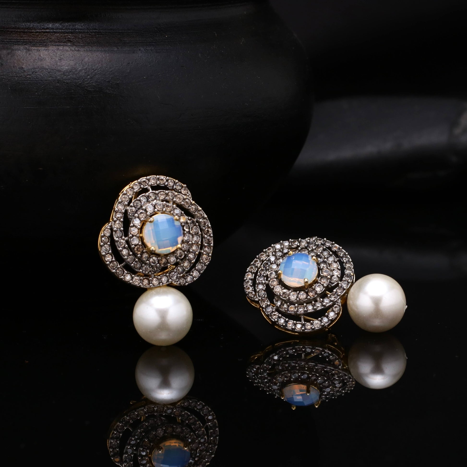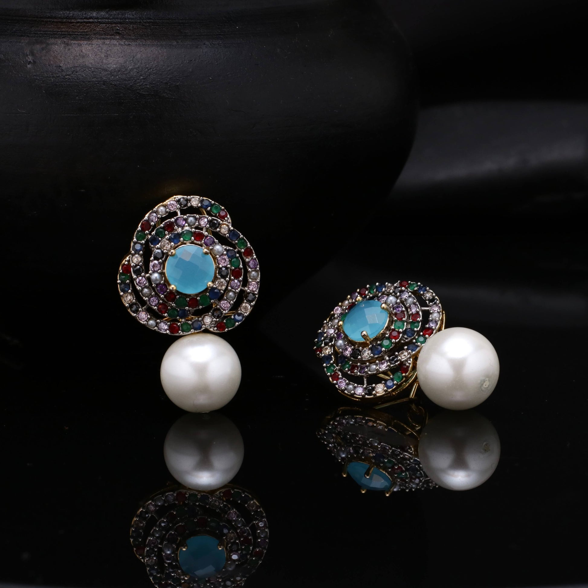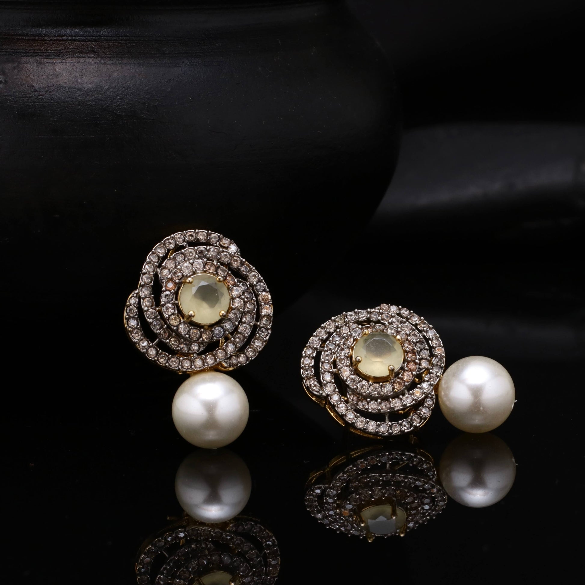 21k Gold Plated Diamond Cut Studs in Real American Zircons, having Pearl drop giving exuberated look.