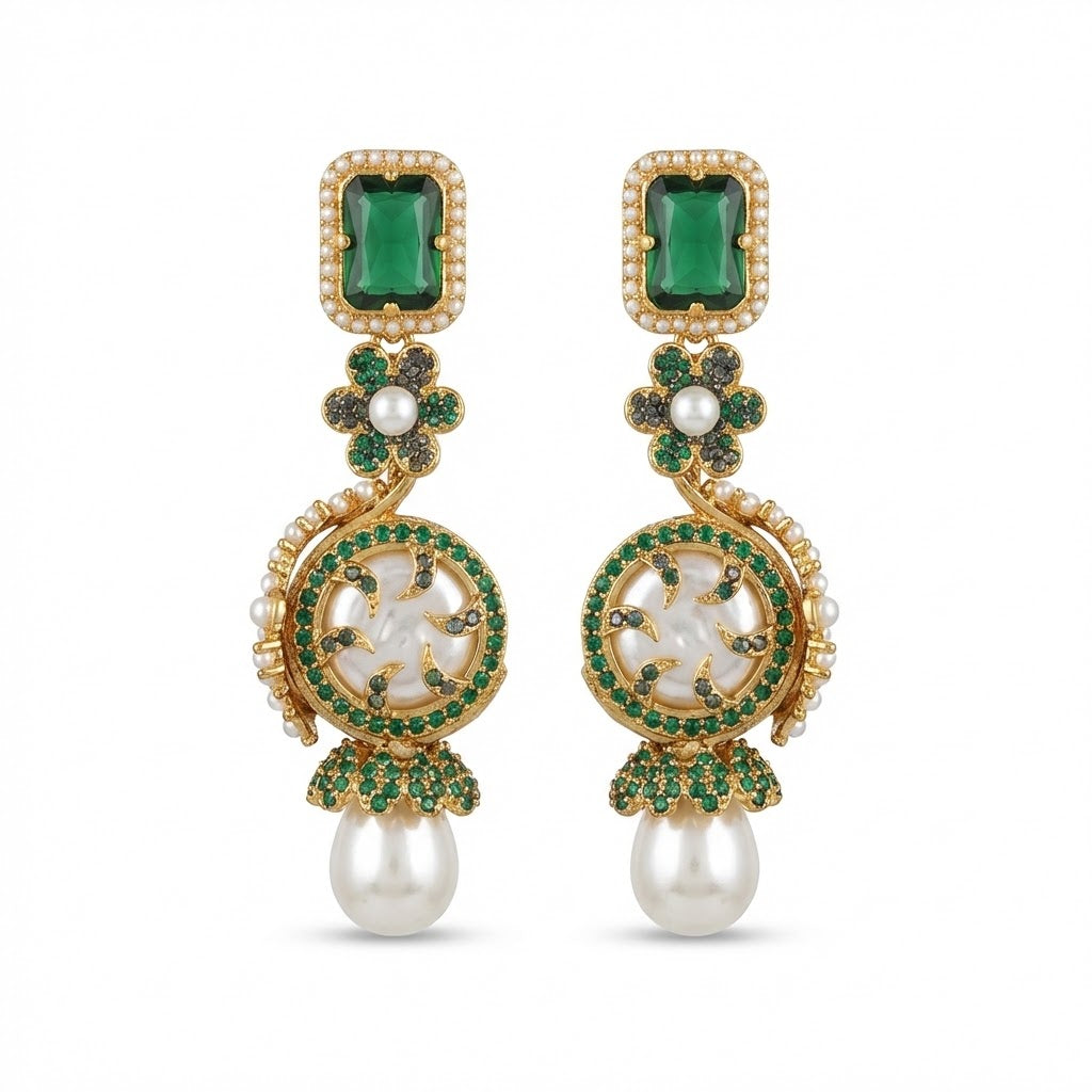 Product Description: Make a bold entrance with these luxurious drop earrings. A stunning combination of icy gems, warm antique gold, and organic pearl textures.