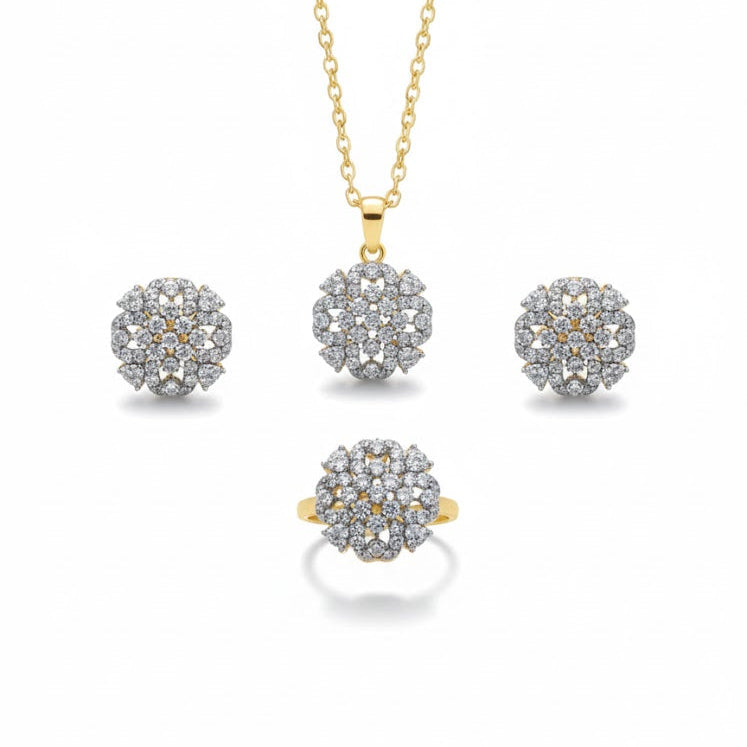 Shine bright with this exquisite Crystal Bloom Set, designed to add a sophisticated sparkle to your outfit. This set features a dazzling pendant, matching earrings (approx. 1.5 inches), and an adjustable ring, all adorned with brilliant stone clusters in a stunning floral design. The perfect combination of elegance and glamour, this set is ideal for both formal and festive occasions.