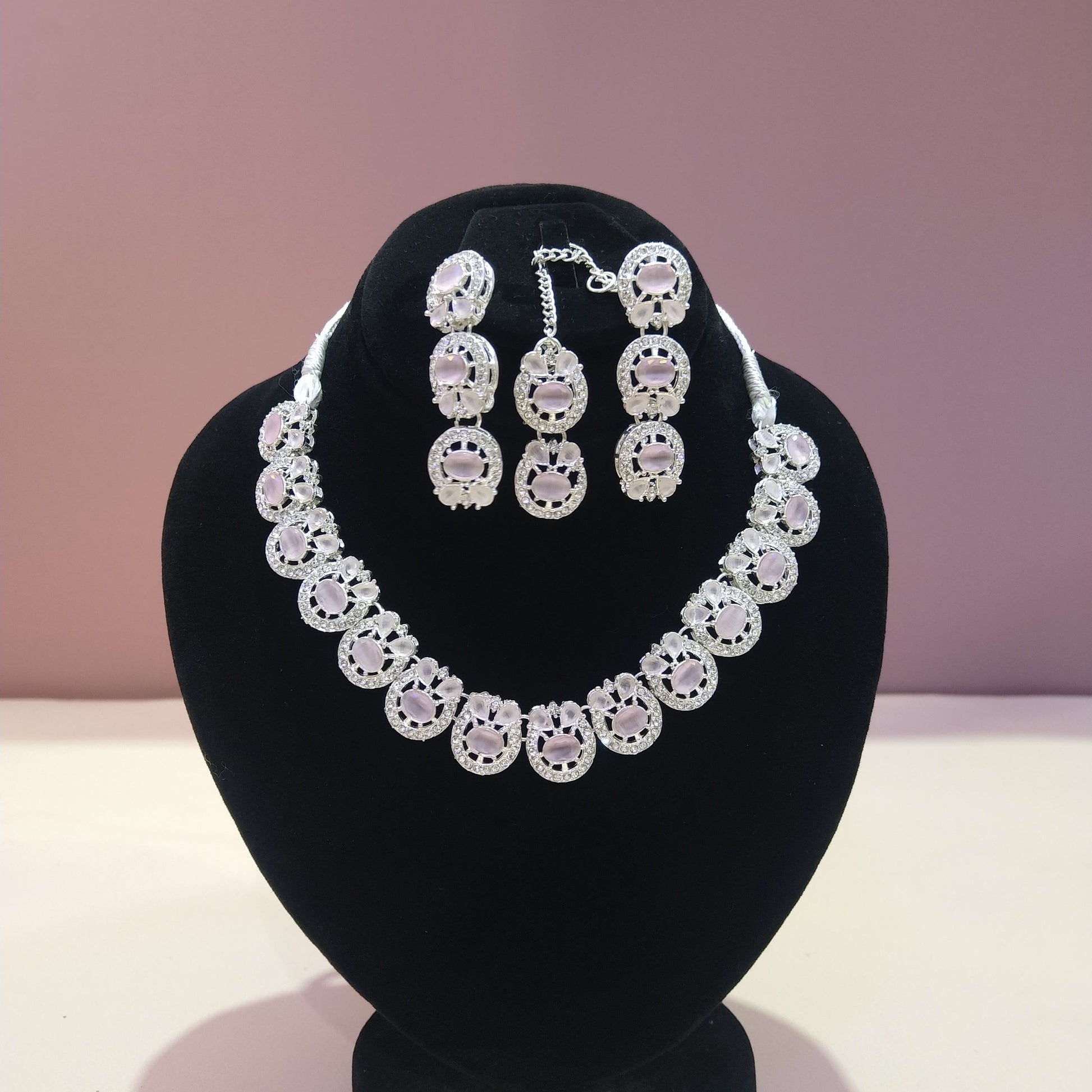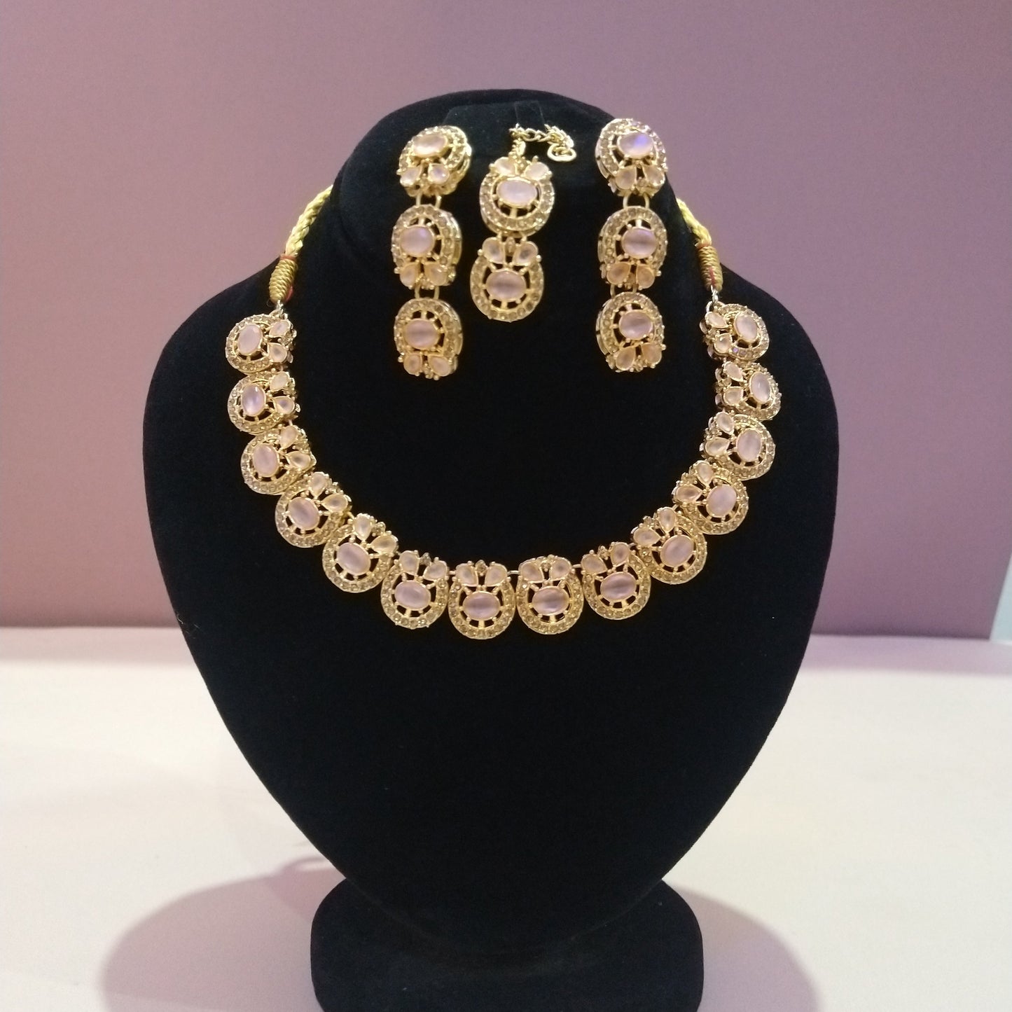 Perfect to add a dash of traditional style to your ensemble, this Chokker and earrings set with teeka is crafted in 22 karat gold plated and Silver polish with Cubic Zircons Necklace Set