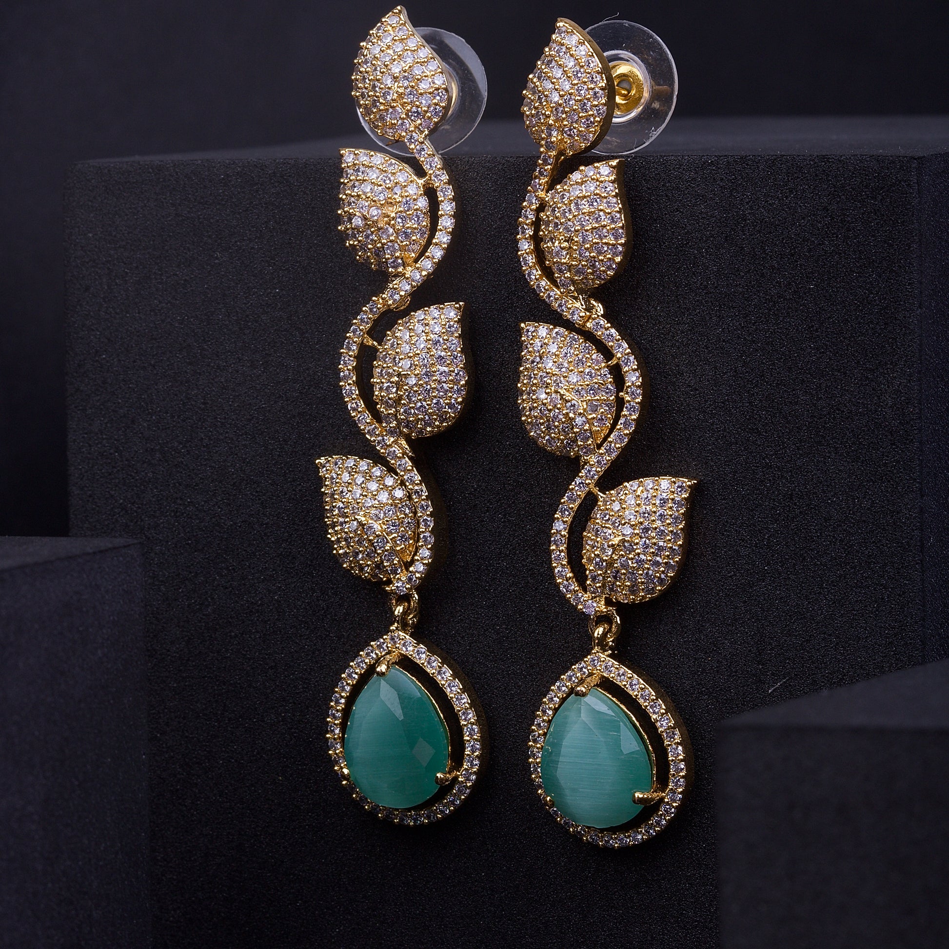 This stunning dual chandelier earring set is a truly unique and elegant piece of jewelry. The earrings feature an elegant design, with pear-shaped white cubic zirconia and brilliant-cut diamonds set in a graceful chandelier shape. The stones are set in high-quality . ensuring a long-lasting and beautiful piece of jewelry.