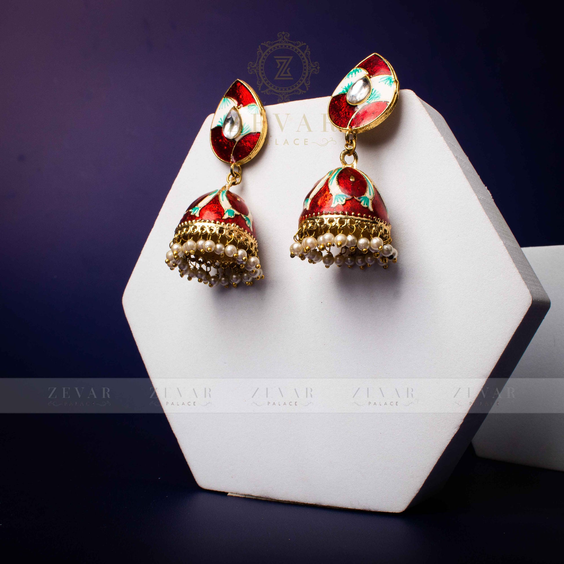 Elegant design naurattan pair of jhumkas cultured with pearl hangings and studded with semi precious rubbies and emeralds.