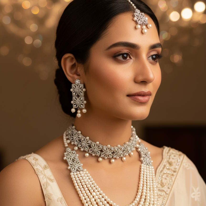 - Complete Set: Includes a stunning choker, a 12-inch multi-layered mala, 2.5-inch earrings, and a 2-inch teeka.