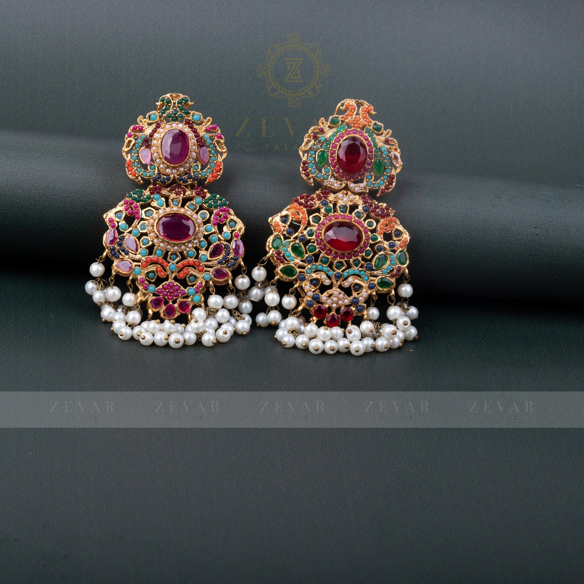 Elegant design naurattan pair of jhumkas cultured with pearl hangings and studded with semi precious rubbies and emeralds.