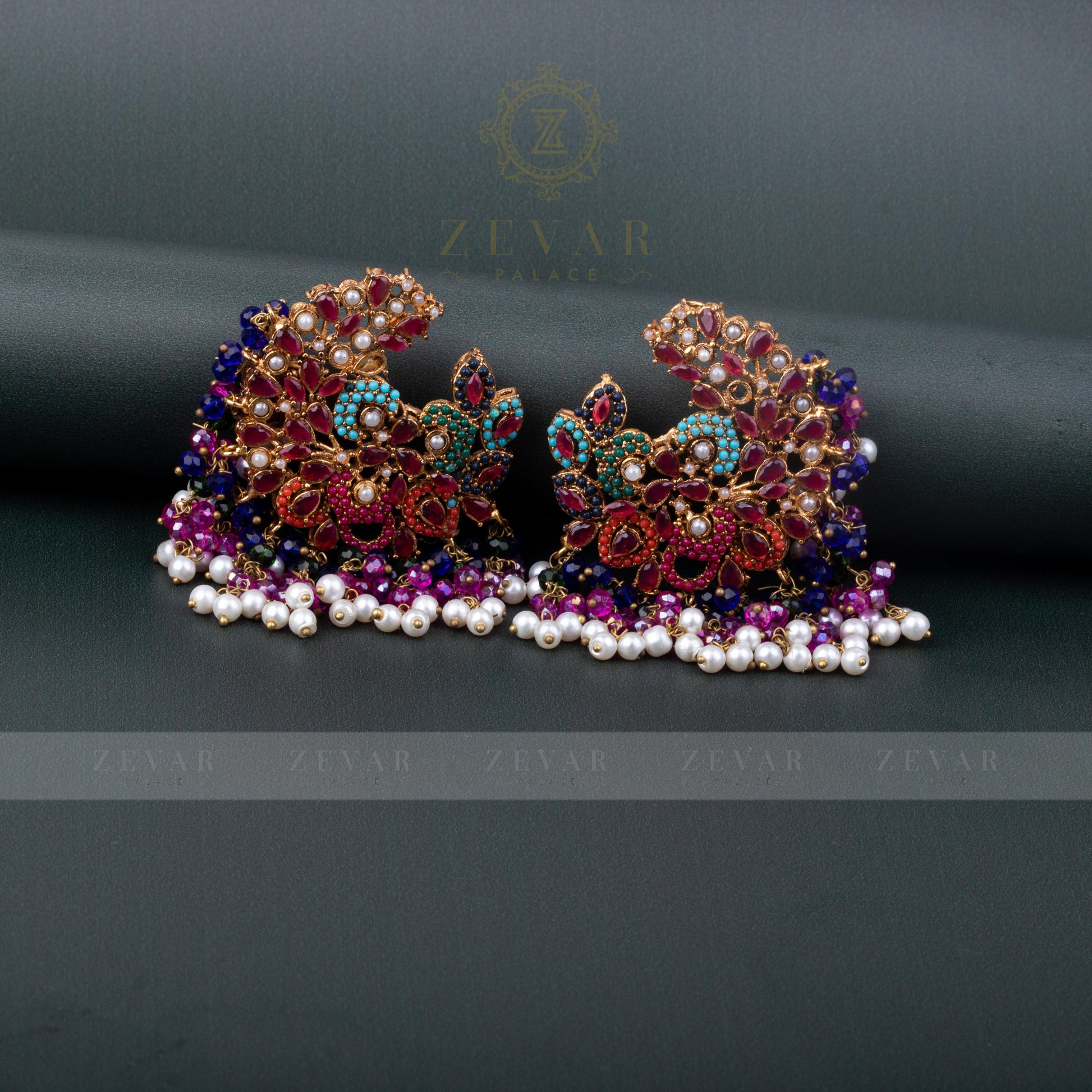 Elegant design naurattan pair of jhumkas cultured with pearl hangings and studded with semi precious rubbies and emeralds.