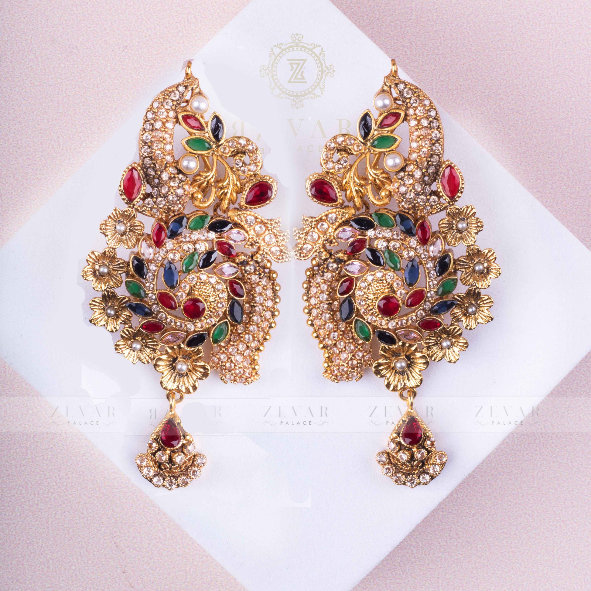 Elegant design naurattan pair of jhumkas cultured with pearl hangings and studded with semi precious rubbies and emeralds.