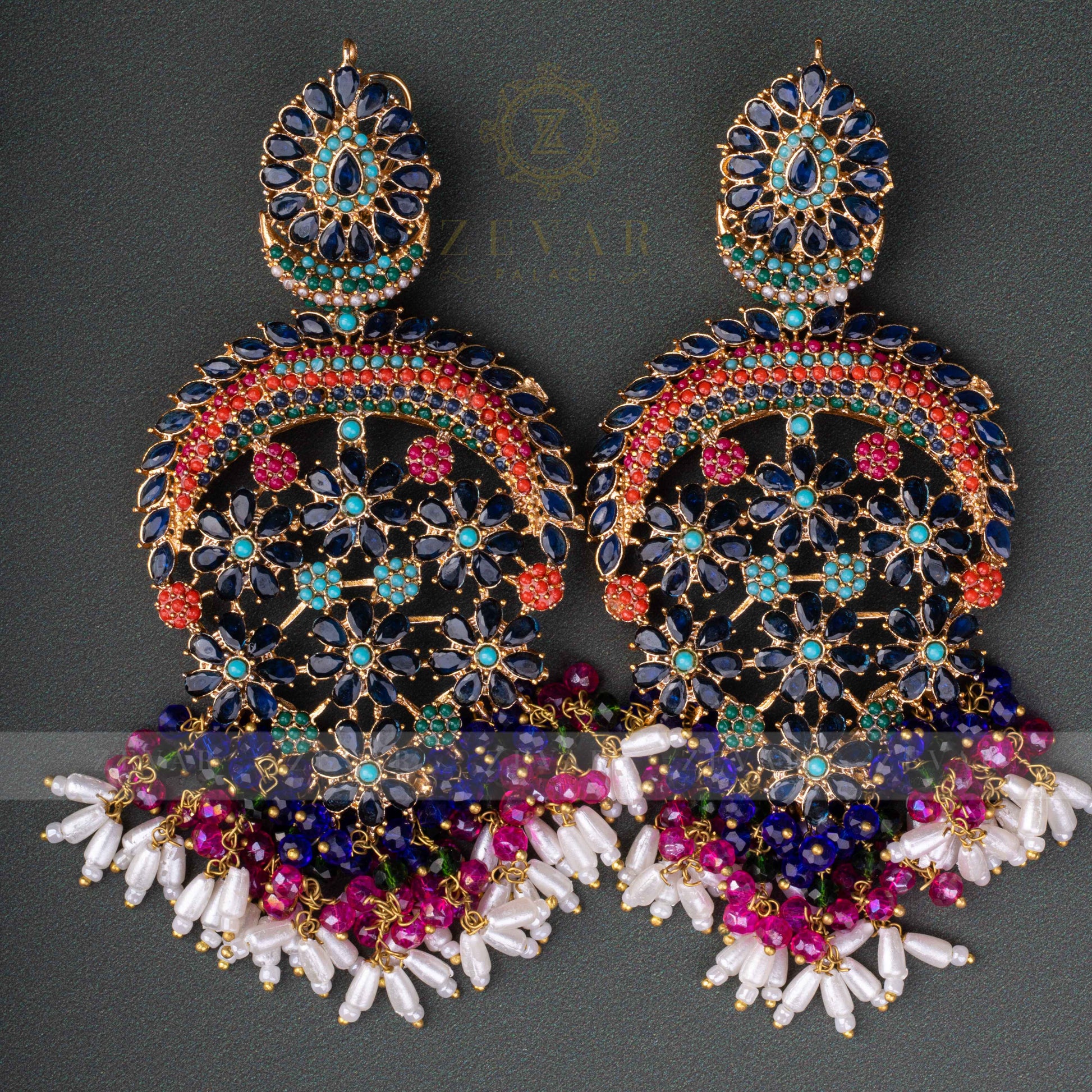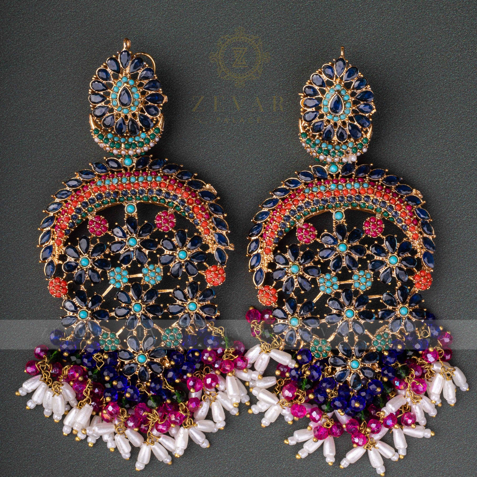 Elegant design naurattan pair of jhumkas cultured with pearl hangings and studded with semi precious rubbies and emeralds.