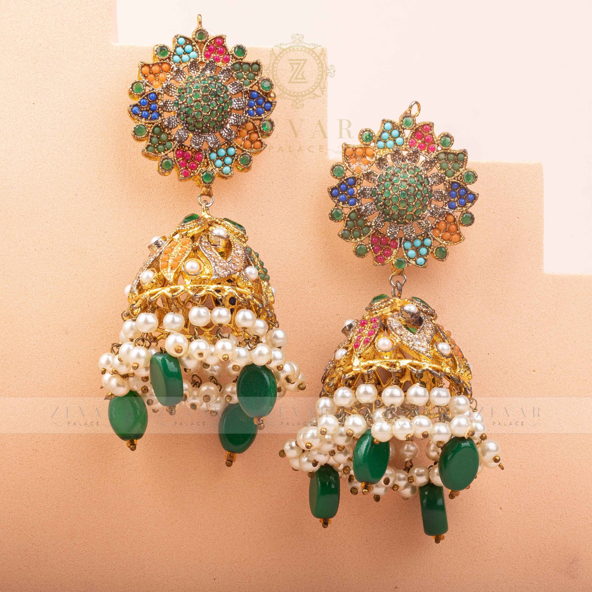 Elegant design naurattan pair of jhumkas cultured with pearl hangings and studded with semi precious rubbies and emeralds.
