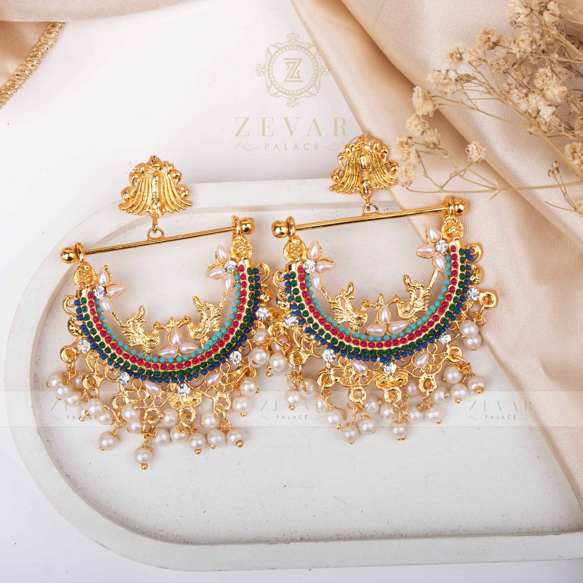 Elegant design naurattan pair of jhumkas cultured with pearl hangings and studded with semi precious rubbies and emeralds.