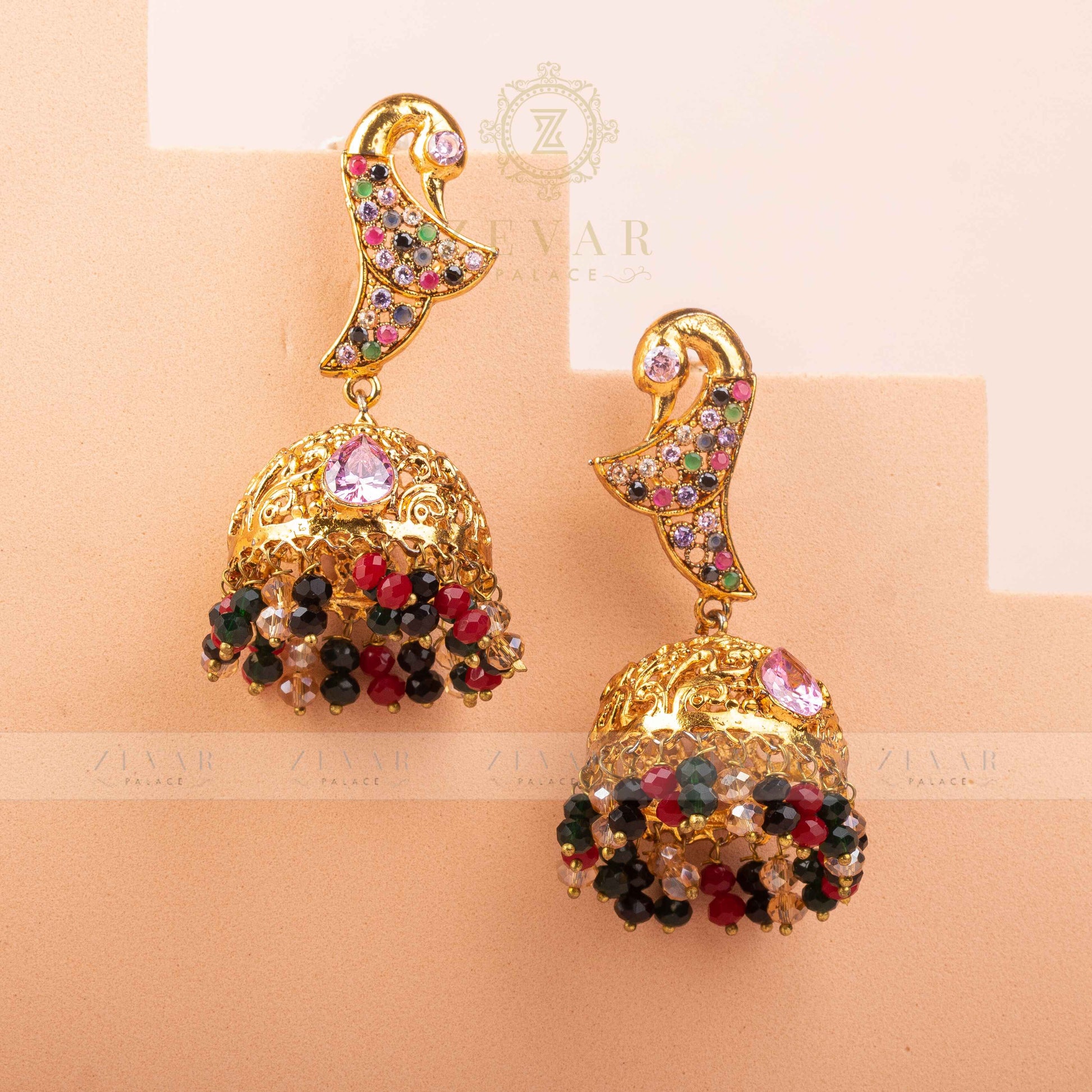 Elegant design naurattan pair of jhumkas cultured with pearl hangings and studded with semi precious rubbies and emeralds.