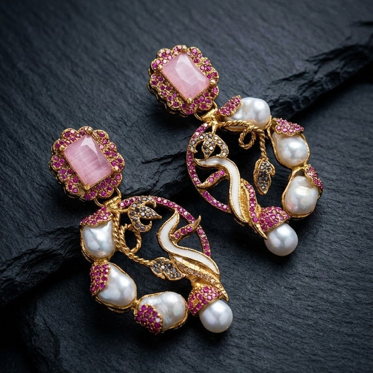 Style: An ornate, vintage-inspired statement drop earring featuring a mix of regal blue tones and organic pearl elements.