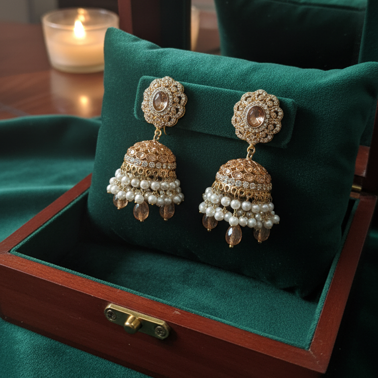 Add regal charm to your collection with our Royal Jhumkas. These stunning earrings are meticulously handmade using premium-quality Laak Kundan, adorned with multicolored beads, and finished with intricate detailing. Their traditional silhouette and vibrant accents make them perfect for festive celebrations or wedding occasions. Completed with a rich 22K Gold Polish for timeless elegance.