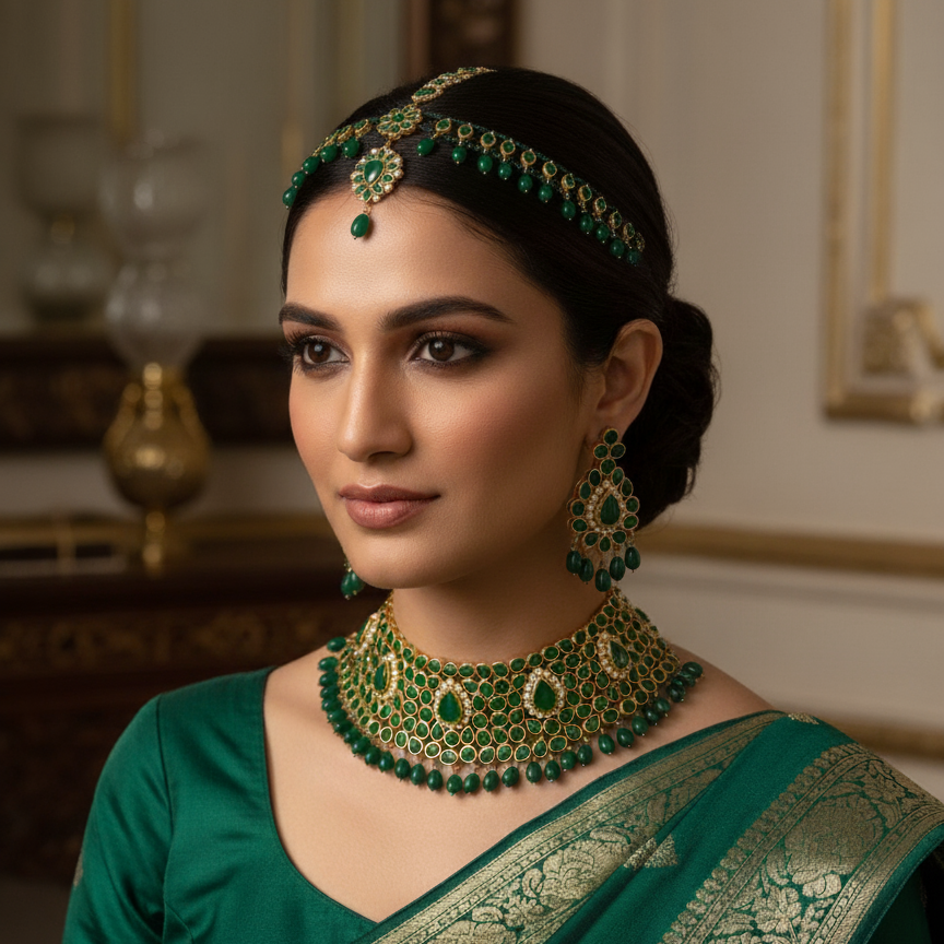 The set includes a grand necklace, earrings (3.5 inches), and a maang tikka (4 inches) featuring a 2.5-inch pearl string that adds an elegant finishing touch.