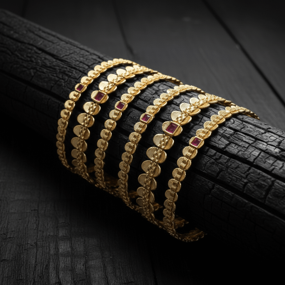 Vivid Ruby-Pink Accents: Adorned with evenly spaced, square ruby-pink stones that provide a stunning burst of color and a traditional contrast against the gold.