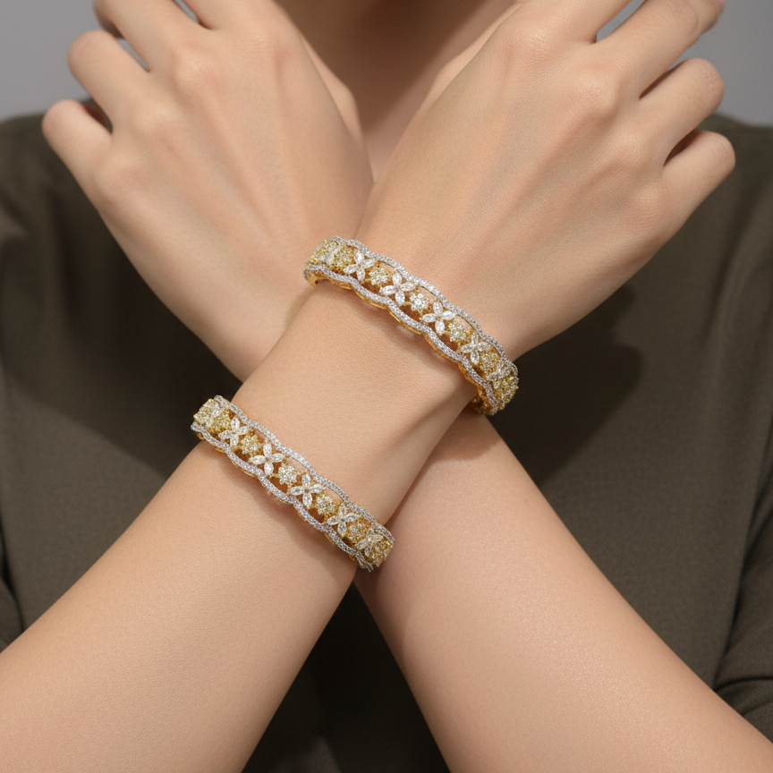 Handmade 22K Gold Polish zircon bangles designed with premium-cut stones that shine like real diamonds. Crafted with fine detailing, these bangles bring a beautiful blend of elegance and tradition — perfect for weddings, mayun, dholki, and everyday festive wear. Lightweight, durable, and finished with a luxurious gold shine, they add the perfect sparkle to any outfit.